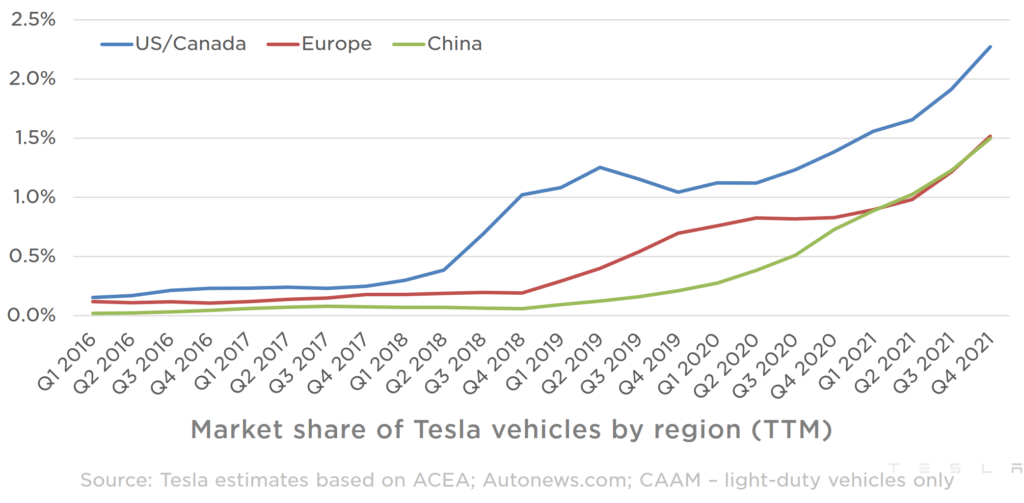 In Europe and China, the share of the Tesla brand has been almost identical for a few quarters, currently at 1.5%