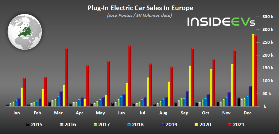 According to EV Volumes’ data shared by Jose Pontes, in December, some 280,241 new passenger plug-in electric cars were registered, which is on par with December 2020 (-0.3% from 281,171).