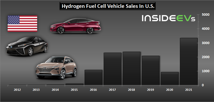 Cumulatively, hydrogen fuel cell car sales in the U.S. reached 12,272 as of the end of 2021 (37% more than a year ago).