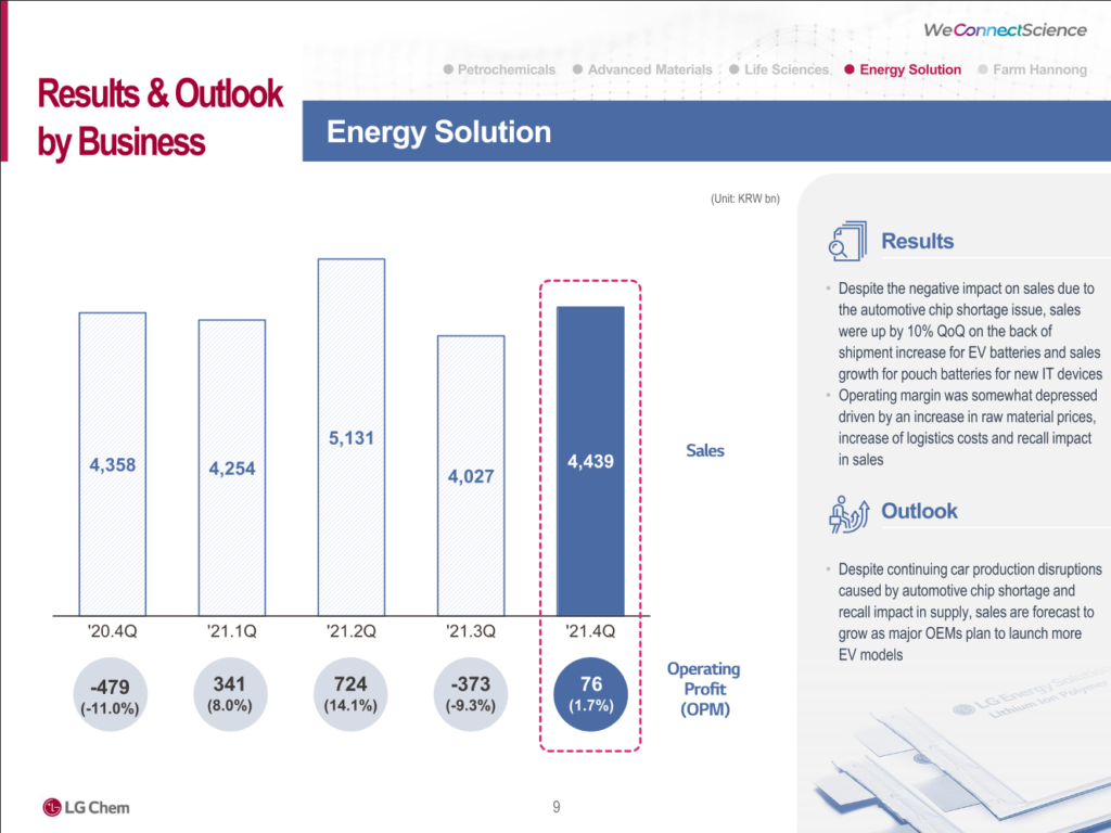 LG Chem‘s LG Energy Solution announced a 10% increase in revenues in Q4 2021, which allowed it to return to profitability after the negative Q3 result – affected by the costs of the Chevrolet Bolt EV/EUV battery recall.