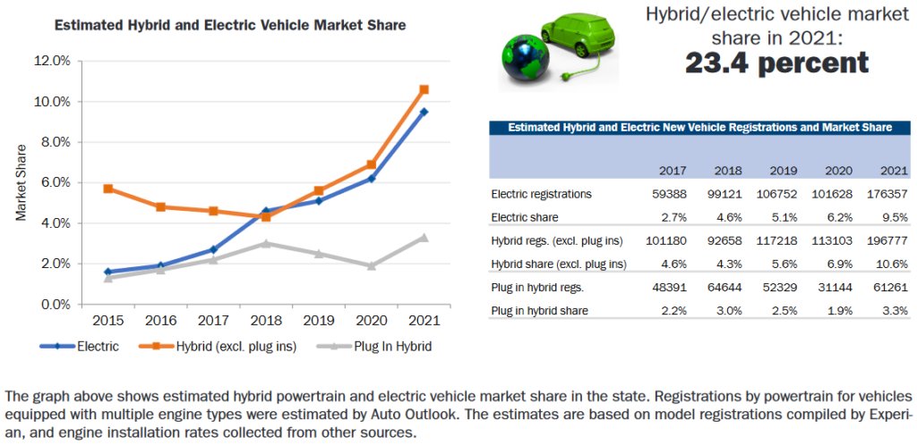 In 2021, the overall light-vehicle registrations in California increased to 1,856,391 (up by 13.3% year-over-year), according to the California New Car Dealers Association (CNCDA)’s latest report. It’s expected that the year 2022 will bring a 4% increase.