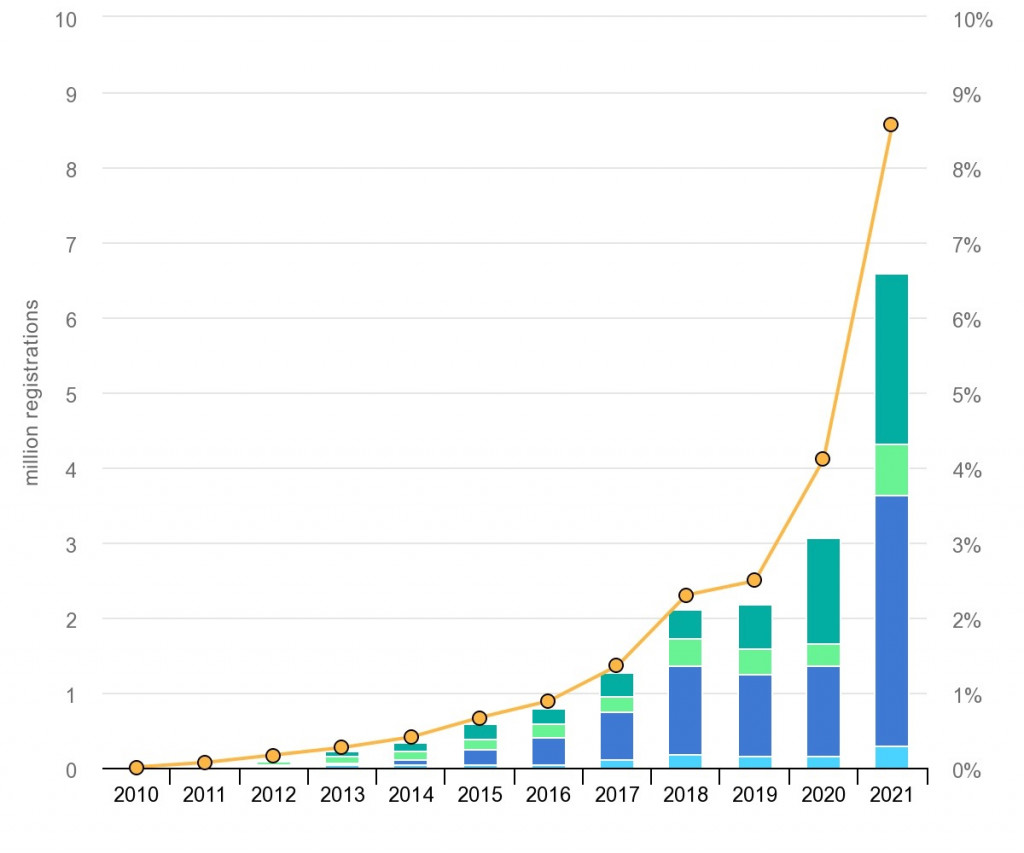 Global EV sales and market share 2010-2021 (from IEA report)