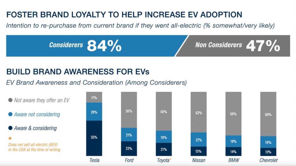 Nissan and BMW are also included in the brand awareness research and their percentages are similar to Chevrolet‘s. As for Toyota’s inclusion in the study, we should note that the Japanese automaker did not sell a BEV in the US when the survey was made in the summer of 2021—the 2023 bZ4X will arrive at US dealers in mid-2022.