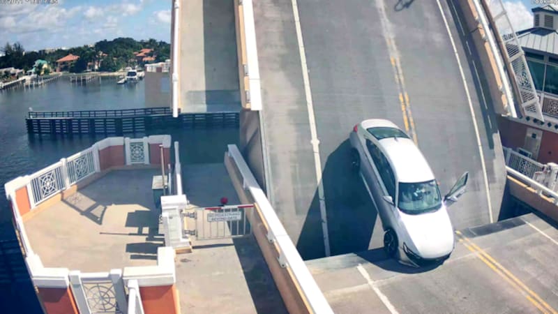 The video above shows a car crossing a bridge in Lantana, Fla., over the Intracoastal Waterway. The Honda Accord begins to cross the bridge, and the safety gates lower behind him. He is almost across when the bridge when he’s confronted by the safety gate ahead of him, and stops. That’s when the bridge starts to rise, and the car gets lifted along with it. As the situation continues to unfold, the driver opens his car door as if to jump out, but there’s clearly a gap below him large enough to fall through, 40 feet to water below, so he scraps that idea. Eventually, the lifted bridge spits the Accord out onto level pavement, and safety. We’ve got to hand it to the driver for appearing to be so calm when he steps out of the car. Incredibly, when the bridge settles back into place, he’s able to drive away.