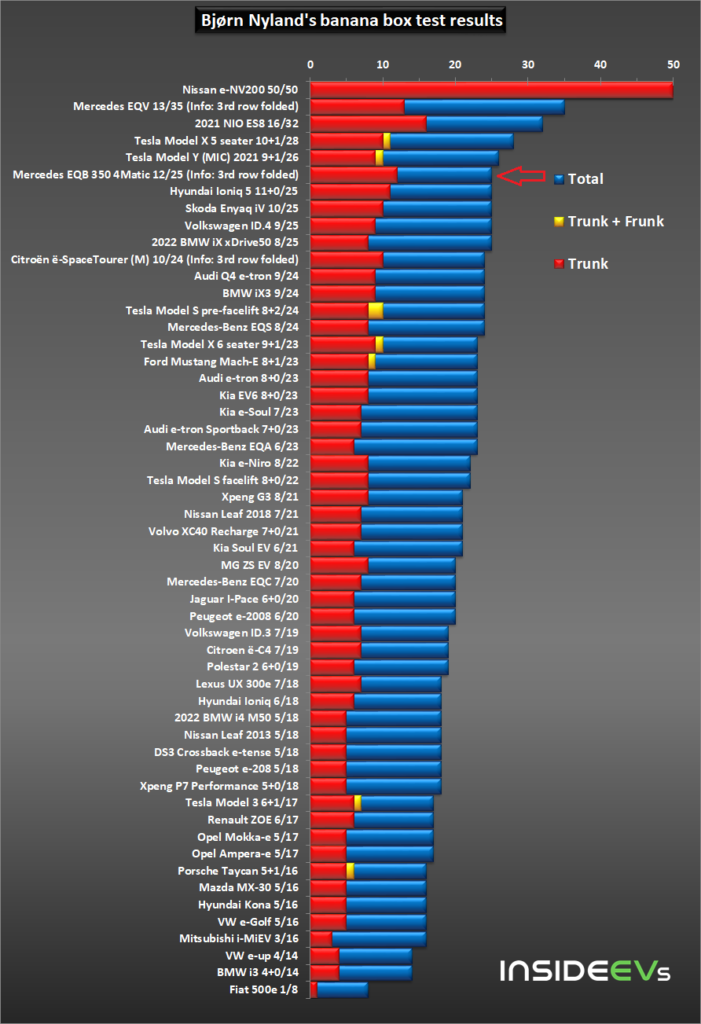 Results (number of boxes: trunk+frunk/total after folding the rear seats) for selected cars: