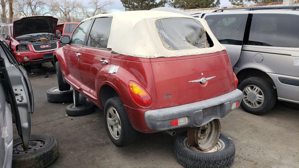 Chrysler started selling PT Cruisers for the 2001 model year, and these “trucks” (yes, they were considered trucks for American regulatory purposes) proved quite popular for at least the first half of the 2000s. A factory-built version with a convertible top appeared for 2005 (and later “won” the Top Gear Worst Car of the Last 20 Years award), but what about the PT Cruiser shoppers who wanted a drop-top before then? It turns out the aftermarket had the solution: the Newport Convertible Engineering conversion, which took new PT Cruisers and added a fully functioning convertible top. According to a discussion on Allpar, 54 of these conversions were performed, and I found one of them in a Denver-area self-service yard last month.