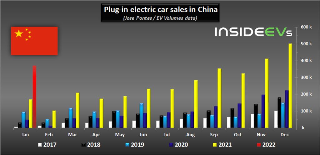 According to EV Volumes’ data shared by Jose Pontes, in January, some 372,615 new passenger plug-in electric cars were registered in China, which is 115% more than a year ago.