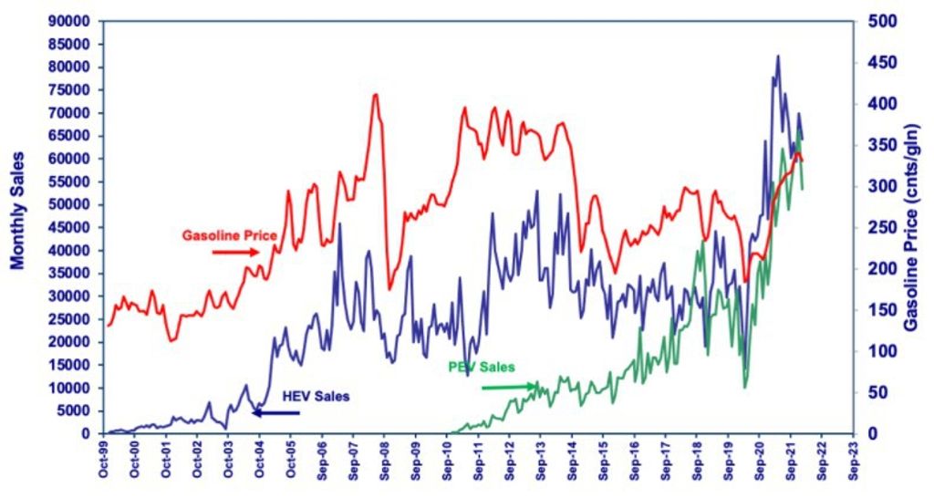 Take a look at this chart from EIA, which has been updated through January 2022. It compares hybrid and plug-in EV sales against gasoline prices.