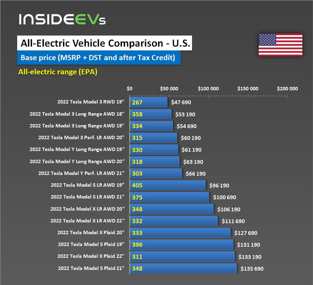 After including the $1,200 DST, there is no way to get a new Tesla Model Y below $60,000 (actually since November 2021). The Tesla Model 3 Long Range AWD heads towards $55,000, but thanks to the entry-level LFP-powered version, there is one version available below $48,000.