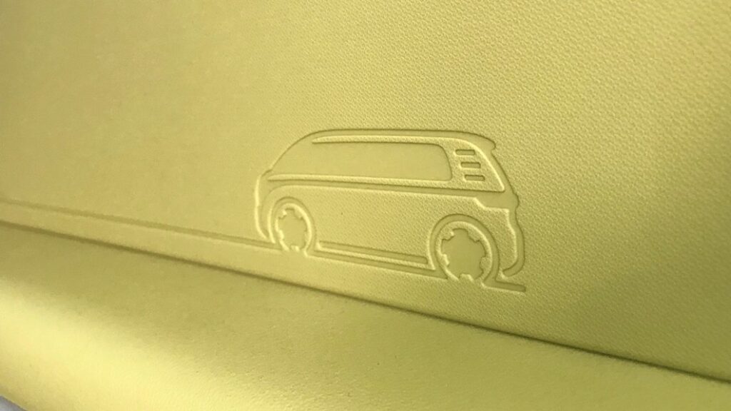 Shown at the top is a silhouette of the Buzz. This design appears in pockets in the cargo area, as well as on the plastic shrouds on the sliding rear seats (shown directly above). The cargo area one really pops with the exterior color trim.