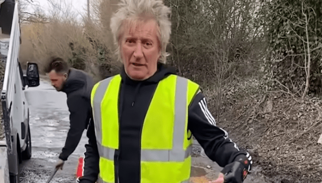 The road near musician Sir Rod Stewart’s home in Harlow, England is in… terrible condition. It’s riddled with water-filled potholes which have reportedly damaged cars on the road and busted the tire of an ambulance. And while these are all genuinely alarming concerns, one of the biggest for Stewart himself is the fact that the potholes render the road simply undrivable for his Ferrari, which sits low to the ground and can’t handle that kind of surface. So, he decided that if nobody else would repair the road, he would.