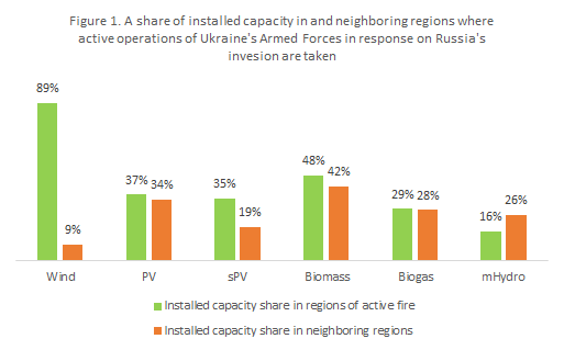 37% of ground, 35% of roof/facade solar power plants, and almost half (48%) of biomass stations are also located in areas of active hostilities, 34%, 19%, and 42%, respectively – in neighboring areas with an extremely high probability of hostilities.