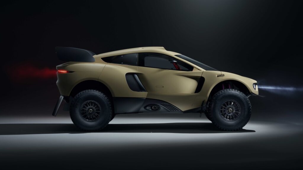 Like the race car, the Hunter’s chassis is a steel tube-frame setup wrapped in carbon fiber body panels. The suspension is a double-wishbone setup front and rear with adjustable dampers. 17-inch wheels with 35-inch off-road tires are standard; behind them you’ll spot six-piston Brembo brakes. The Hunter street car also gets an extra 50mm of suspension travel to improve ride quality over the racer’s. The exterior may look a bit like Pikachu auditioning for a “Cars” sequel, but at least you can tell all your friends that it was penned by Ian Callum. That means it’s basically a Vanquish, right?