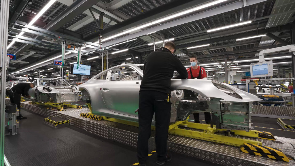 The video begins with the GT3 117-step assembly process. It starts with robots assembling and welding chassis components. Line workers appear when it’s time to hang the doors and front fenders. You can see the car take shape as it moves from station to station.