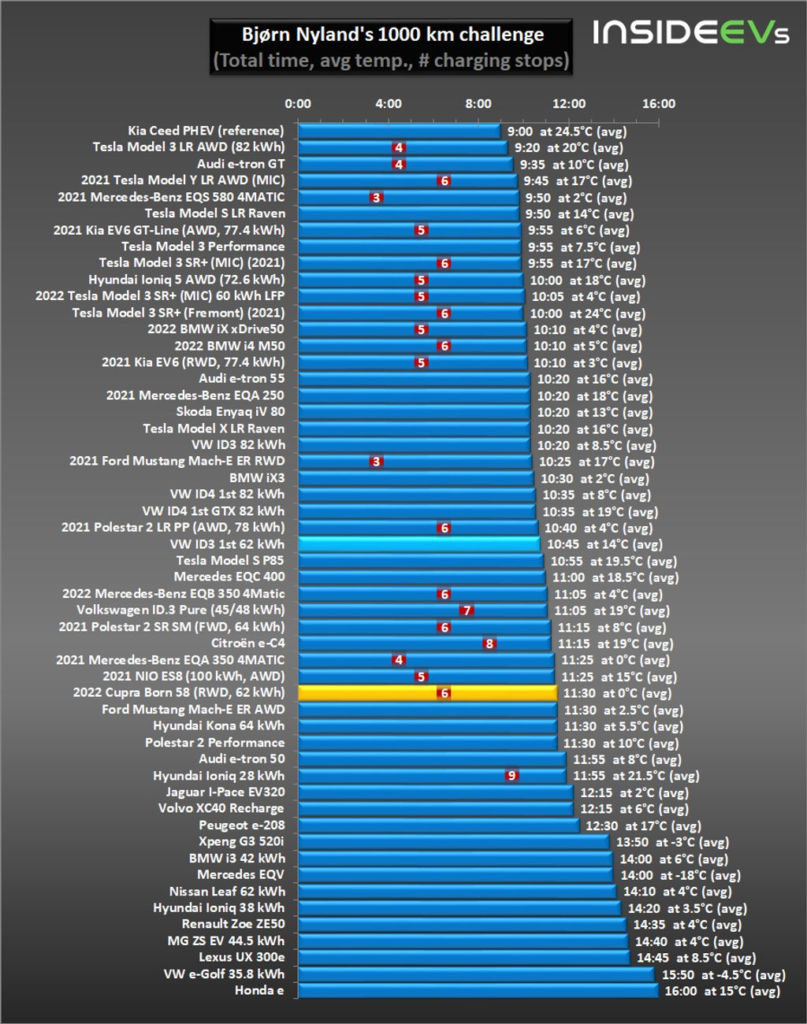 According to the video, the Cupra Born with a 62 kWh battery (58 kWh usable) completed the distance, at an average temperature of 0°C, in 11 hours and 30 minutes (after some time deductions).