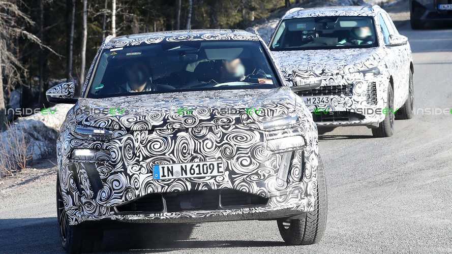 Our spies have sent us several batches of photos showing camouflaged Q6 E-Tron prototypes, but this one is special. It shows the RS Q6 E-Tron cold weather testing in northern Europe alongside several camouflaged (probably non-RS) prototypes, as well as a BMW iX, which we presume is there as some kind of benchmark.