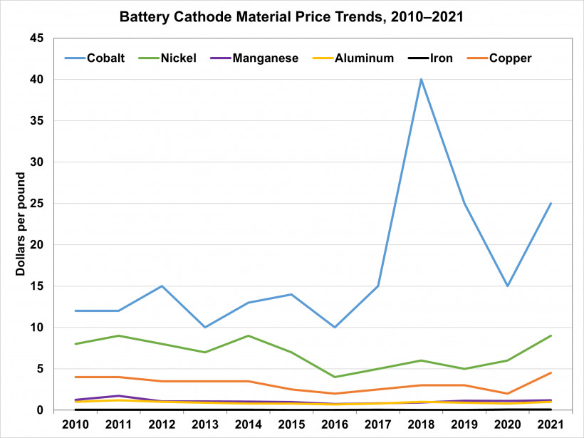 EV battery cathode material price trends, 2010-2021 – U.S. DOE
