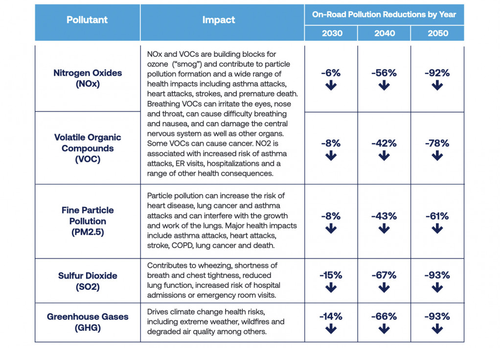 The policy shift would start paying dividends in public health even by 2030, with a projected 6% and 8% drop in nitrogen oxides (NOx) and volatile organic compounds (VOC), respectively. 2030 would also bring a projected 8% drop in PM2.5 fine particulate emissions, a 16% drop in sulfur dioxide, and a 14% reduction in greenhouse gas emissions.