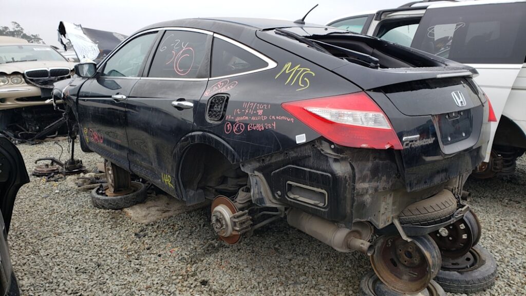 Most of my junkyard explorations take place along Colorado’s Front Range and in the urban areas of coastal California, which means I document a lot of weird old machinery that rusted to nothingness in wetter, saltier regions. More recent examples of interesting automotive history are hard to find in such yards, however, just because newer vehicles are still worth fixing up when something expensive breaks; this is why I remain unable to find a discarded Suzuki Equator. Because the Honda Accord Crosstour was such a puzzling car/truck/wagon/whatever, I’ve done my best to find a junkified one that wasn’t crashed beyond recognition, and I succeeded a few months back in a self-service yard in California’s Central Valley.
