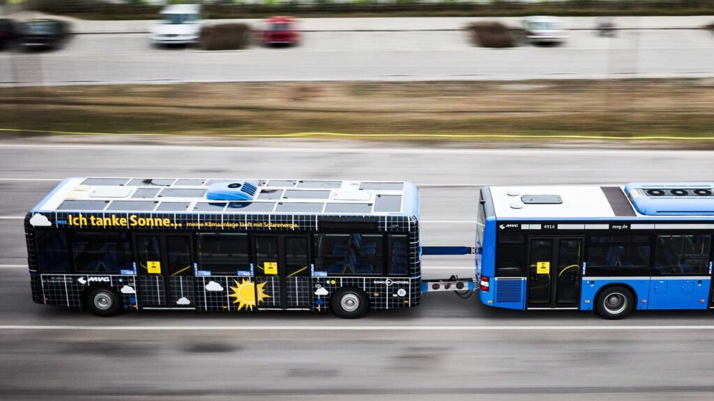 Munich’s local transport company (the MVG, short for Münchner Verkehrsgesellschaft) has just initiated testing of a solar trailer that can be hitched to its existing buses, promising to lower their carbon footprint quite significantly every year. The trailer is covered in solar panels provided by Sono Motors, and it helps save fuel by providing power for heating, ventilation and air conditioning, as well as the trailer’s steering system.