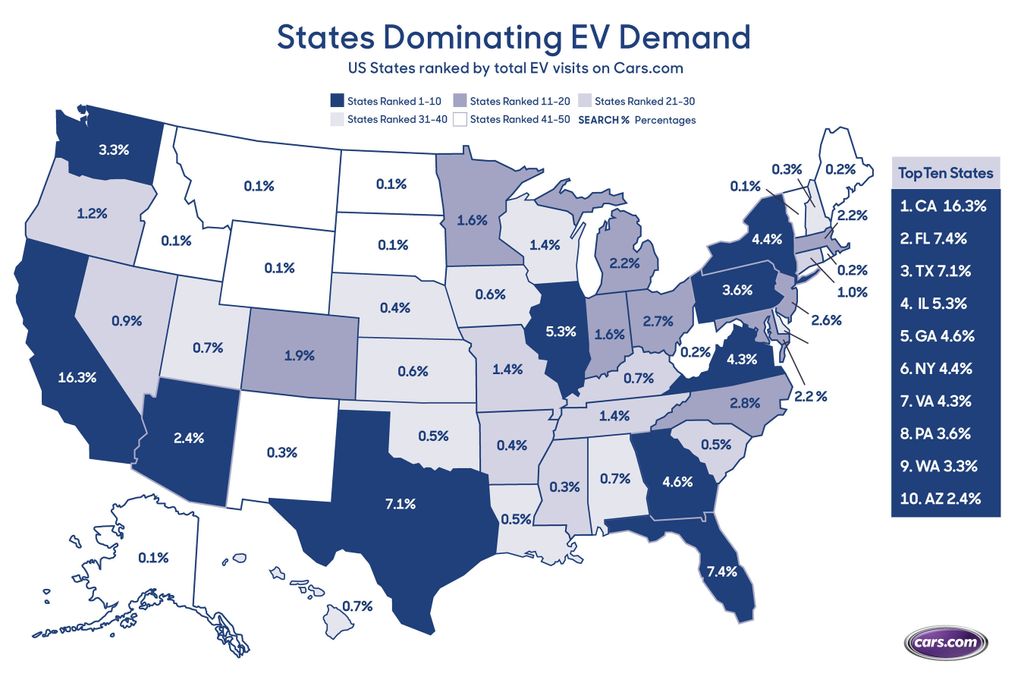 The states where the highest numbers were recorded from are, incidentally, the ones where EV adoption is already the most advanced – California (16.3 percent of searches), Florida (7.4 percent) and Texas (7.1 percent). At the other end of the tables, we have the two Dakotas, Alaska, Idaho, Montana and Wyoming, each of which only accounted for 0.1 percent of searches.