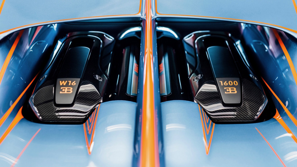 Power is provided by the same 8.0-liter quad-turbocharged W-16 used in other versions of the Chiron, but in the Super Sport it’s tuned for 1,578 horsepower, up from the standard 1,480-hp rating.