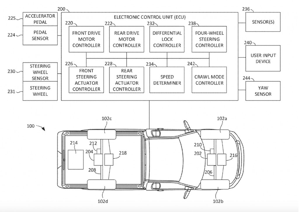 Filed with the United States Patent and Trademark Office (USPTO) in September 2020 and published March 31 of this year, the application is for “crawl operations for four-wheel steering vehicles.” An accompanying image shows a previous-generation Ford F-150 Raptor (which never had four-wheel steering, of course), but with front and rear motors, indicating this system will be used with electric trucks.