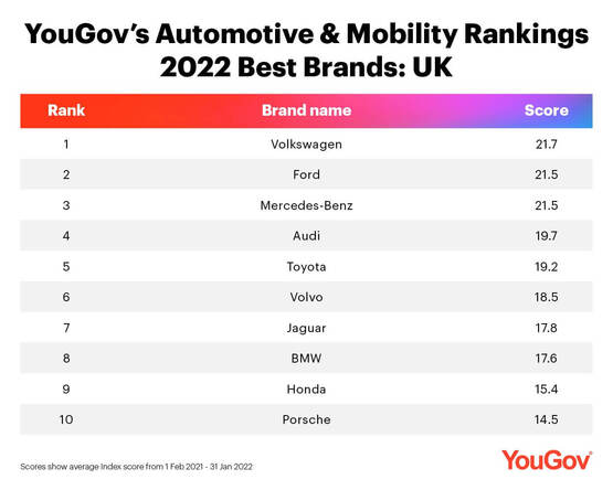 Volkswagen recorded an Index Score of 21.7, ahead of Ford (21.5) and Mercedes-Benz (21.5). Other brands also featured in the top 10 include Audi (19.7), Toyota (19.2), Volvo (18.5), Jaguar (17.8), BMW (17.6), Honda (15.4), and Porsche 14.5).