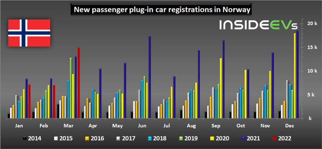 The most important is the new all-time monthly record of all-electric car registrations. In March, 13,983 new BEVs were registered (up 62%), which translated into a record share of 86.1%. No other country can match Norway in terms of all-electric car share.