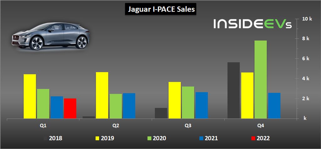 According to the press release, global retail sales of the Jaguar I-PACE in Q1 2022 amounted to 2,014, which is not only 10% less than a year ago, but basically the worst result since the market launch in 2018. The Jaguar I-PACE’s share out of the total Jaguar volume increased to 13.8% (compared to 9.5% a year ago).