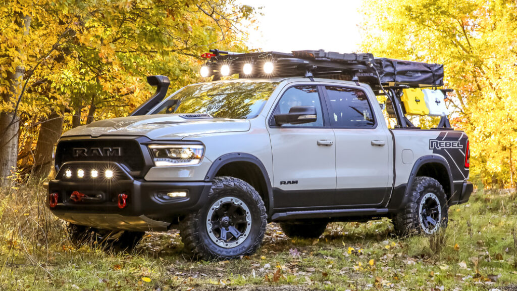 Stellantis filed a patent with the U.S. Patent and Trademark Office on April 12, initially found by Car and Driver, in the generic category “Automobile Body.” But the images within portray a specific vehicle: The 2020 Ram Rebel 1500 Off the Grid (OTG) concept from the 2019 SEMA show. That concept dipped a regular old Ram in a vat of Mopar and third-party accessories, the result a rig built for bugging out.
