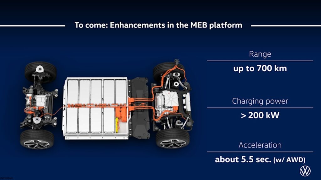 VW didn’t give away how it plans to achieve any of this, so it could entail comprehensive change to every aspect of the MEB powertrain, from larger batteries with a revised chemistry to more powerful motors. These are goals to be achieved sometime between now and 2026, when VW’s next-generation SSP battery-electric platform arrives, so it’s likely that changes coming for MEB will feed into the SSP.