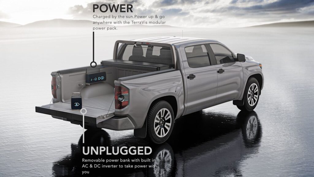 It appears the Solis is what Worksport’s customer-facing side calls the TerraVis, which is the solar cover announced last year, pictured above on a Toyota pickup. The site for that product says modular monocrystalline solar panels with around 22% efficiency are mounted in the tonneau’s power rail. That modularity means depleted cells can be swapped for fresh units. The captured energy is fed into a modular power bank of individual 2-kW power units attached to the inner wall of the bed. The last unit is a portable battery bank that can hold 1.5 kilowatts, fitted with a 1,500-watt AC inverter and four 1,500-watt outlets.