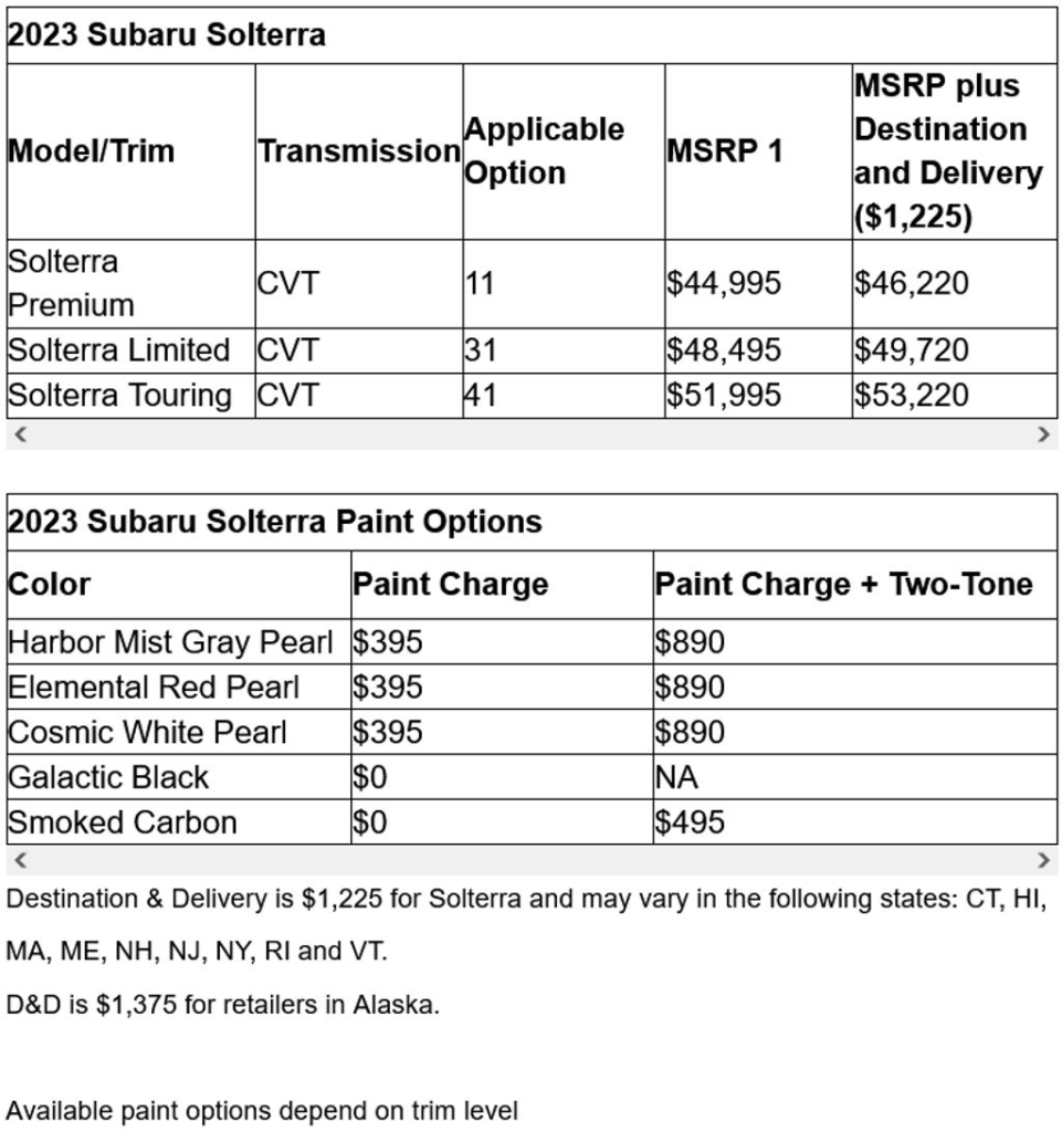 Subaru of America announced today prices for its first all-electric model in the US, the 2023 Subaru Solterra, which will be available in all 50 states.