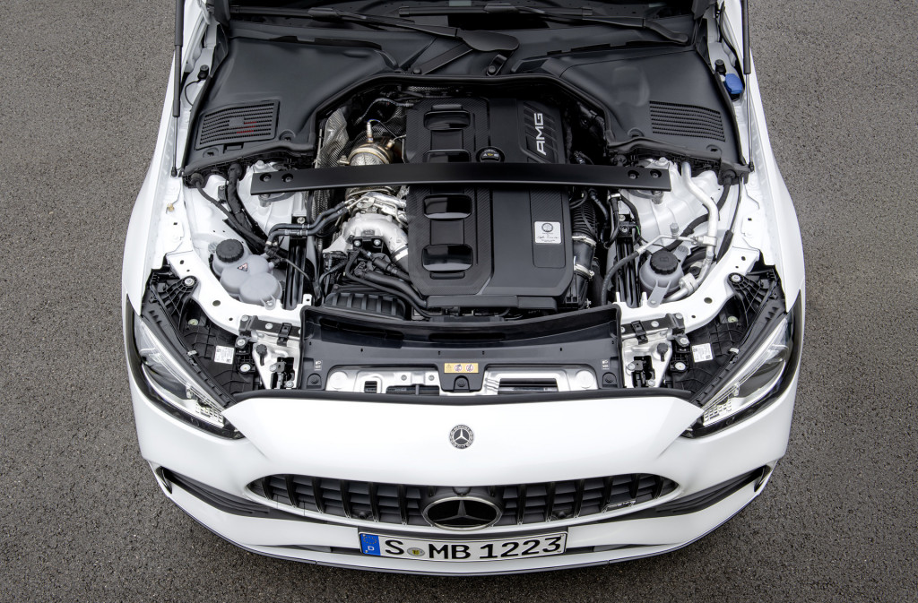 The engine in the C 43 generates 402 hp and 369 lb-ft of torque on its own, with the mild-hybrid system, essentially a beefed up starter motor that also acts as a generator, able to provide a temporary boost of 13 hp during high-load situations. Drive goes to all four wheels via a 9-speed automatic and rear-biased all-wheel-drive system (31/69 front-to-rear split), and AMG also fits an all-wheel-steering system as standard.