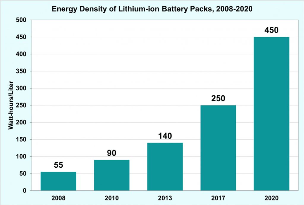 During the past decade, lithium-ion batteries improved significantly in terms of volumetric energy density, which describes the amount of energy that can be contained within a given volume.