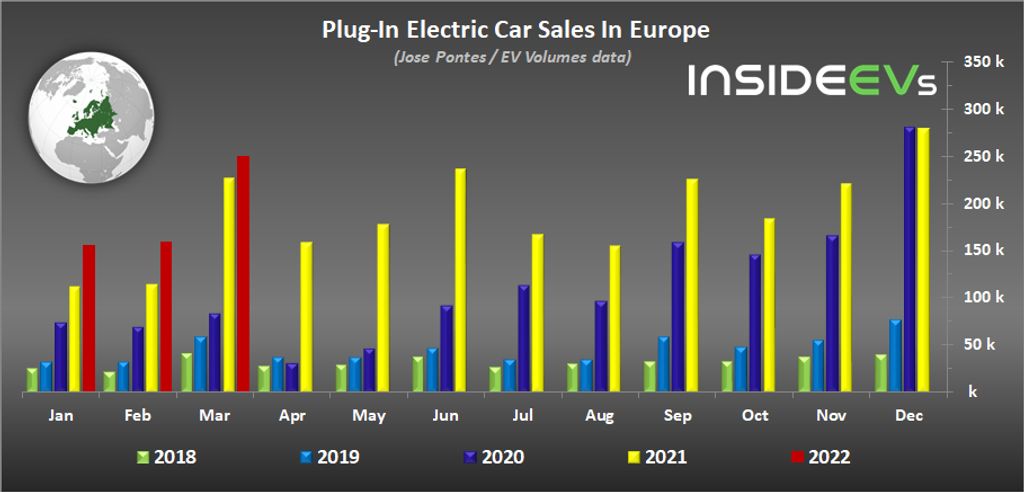 According to EV Volumes’ data, shared by Jose Pontes, roughly 250,000 new passenger plug-in cars were registered in Europe last month, which is 10% more than a year ago. More importantly, it’s the second-highest monthly result ever.