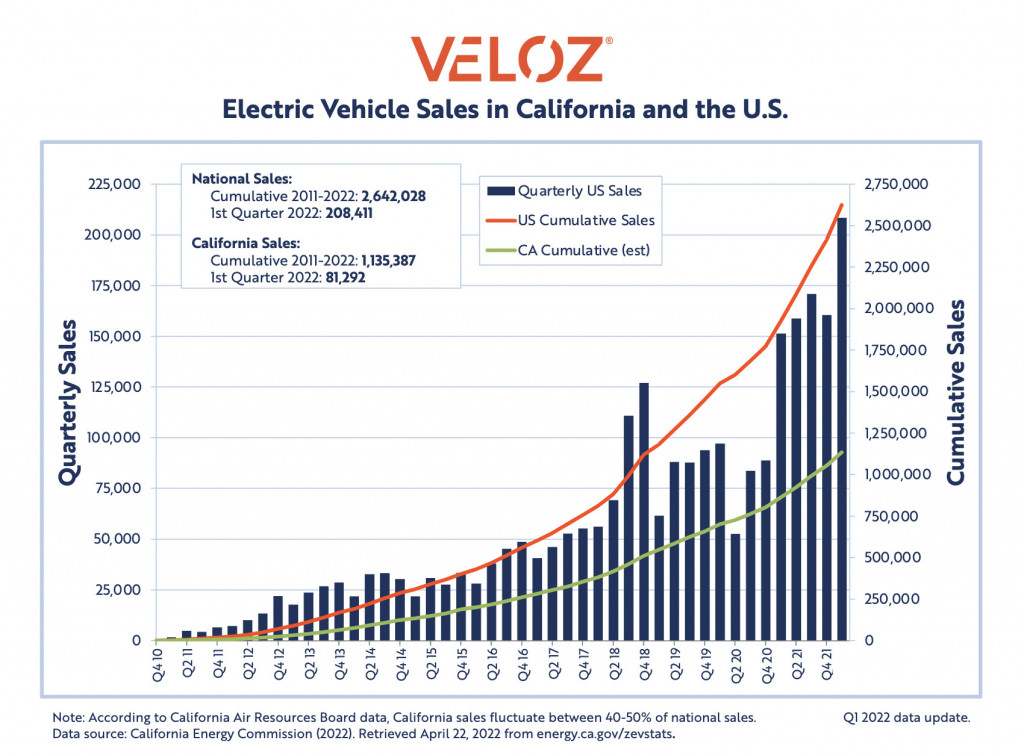 According to Veloz, which has been keeping a tally of EV sales going back to late 2010 and the arrival of the Nissan Leaf, that now adds up to a cumulative 2.64 million national sales and nearly 1.14 million cumulative California sales.
