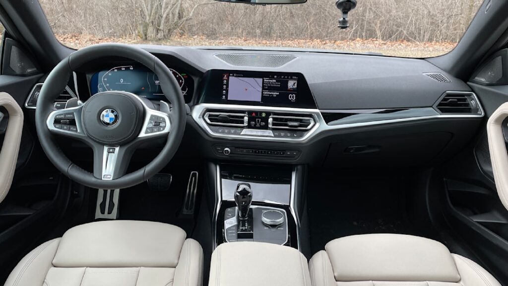 The 230i tester (though everything in this story equally applies to the M240i xDrive) we have is fitted with the BMW Live Cockpit Professional upgrade, which replaces the standard analog gauges and 8.8-inch infotainment display with the fully digital 12.3-inch digital cluster and 10.25-inch infotainment display. It’s well worth the $900 option, as the bigger screens look great, and BMW’s iDrive 7 software is spectacular to use with the extra real estate. The iDrive rotary knob is neatly positioned in a natural spot to the right of the shifter, but those who prefer using the touchscreen will enjoy that it’s canted toward the driver and responds to inputs instantly.