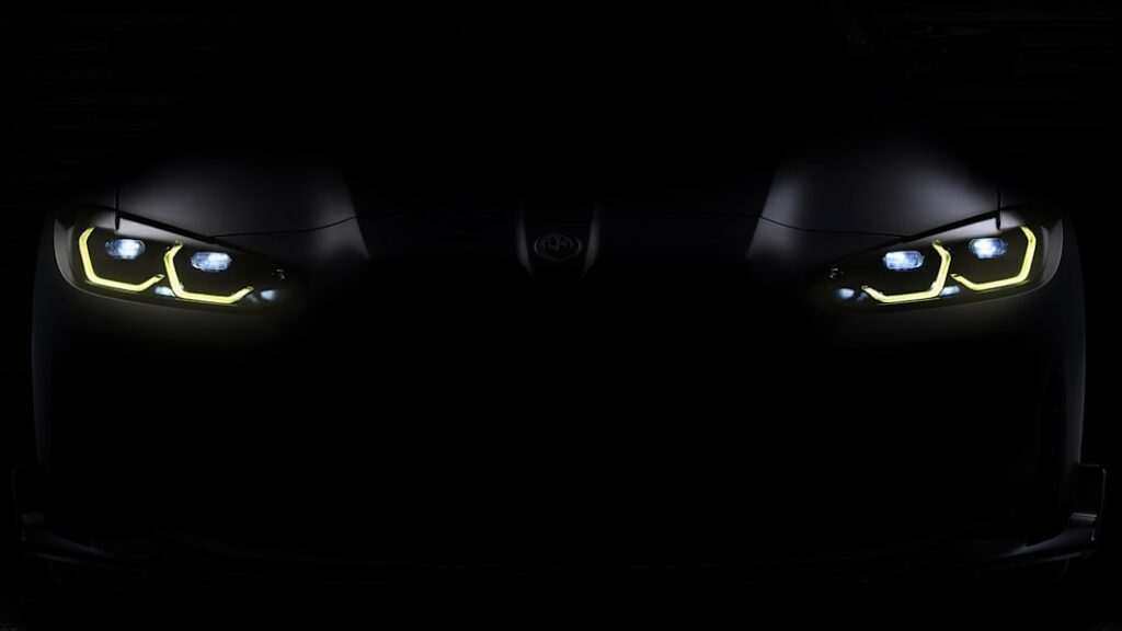 In back, we can make out the silhouette of the ducktail spoiler shaped into the decklid. Below that, we’re not sure what to make of the taillights. They could be LED, or it’s possible they’re OLED units like those BMW used on the 2016 M4 GTS. It’s just that we haven’t seen taillights matching these on any of the M4 CSLs caught in spy shots nor in a special video BMW M put out earlier this year. That video, called “We are M,” included a split-second peek at an M4 CSL with its taillights lit. None of the units included the fine, three-dimensional angel hair lines found in this latest tease.