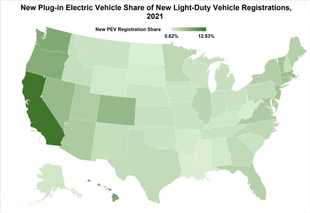 “Note: PEV include plug-in hybrid electric vehicles and all-electric vehicles. New registrations include model year 2021 and 2022 vehicles registered in calendar year 2021.