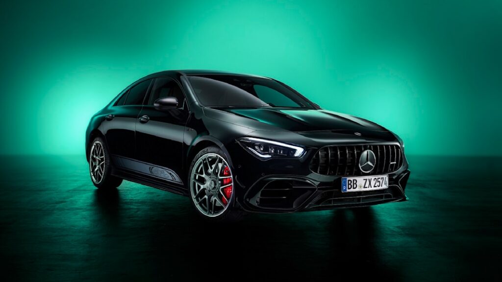 AMG’s history isn’t as straight-forward as it may seem: it was founded in 1967, and it remained independent (though heavily focused on Mercedes-Benz models with a small handful of exceptions) until it joined DaimlerChrysler in 2005. Fast-forward to 2022 and the firm, which is now called Mercedes-AMG, operates as a full-blown sub-brand that has developed a couple of cars from scratch. The CLA 45 Edition 55 celebrates this heritage with Cosmos Black Metallic paint, AMG-themed decals on the bottom of the doors, and 19-inch cross-spoke wheels.