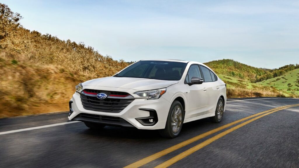 A new Sport trim for 2023 comes with its own design changes. Subaru incorporates a red accent strip through the front grille, as well as “magnetite gray” side mirror covers and rear spoiler. Plus, it gets unique gray-painted 18-inch alloy wheels. Backing up the Sport name is a standard 2.4-liter turbocharged engine along with a “sport-tuned” suspension that none of the other Legacy models get. The interior comes in a black and gray two-tone cloth, and it’s accented by red stitching — none of the other Legacy trims get this interior. And as far as equipment goes, the Sport gets everything the Premium trim has, but adds LED fog lights, a power moonroof and navigation.