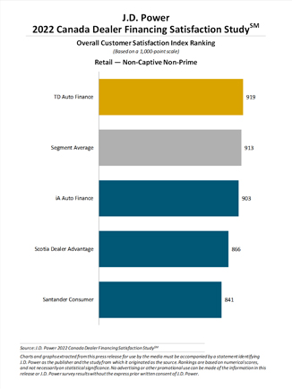 In the retail—non-captive prime segment, TD Auto Finance ranks highest for a fifth consecutive year, with a score of 929. Scotiabank (914) ranks second. The segment average is 905.