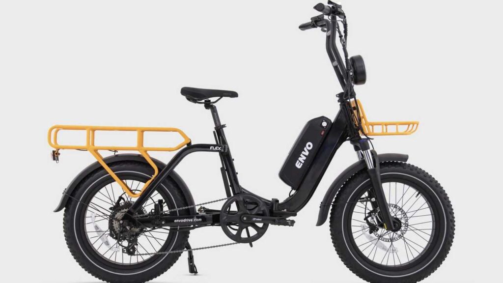 The Urban is up next. The Flex Urban is a sleek, light, and compact 20 x 3-inch fat tire electric bike with a similarly designed folding aluminum as that of the Overland. It employs a unisex and uni-size step-through frame design, and a dual battery optional setup. In contrast to the Overland, the Urban is down on power with 500W of street-legal power and a range of up to 125 miles. It has budget-focused mechanical disc brakes, a rear rack with two child seats, and an 8-speed drivetrain.