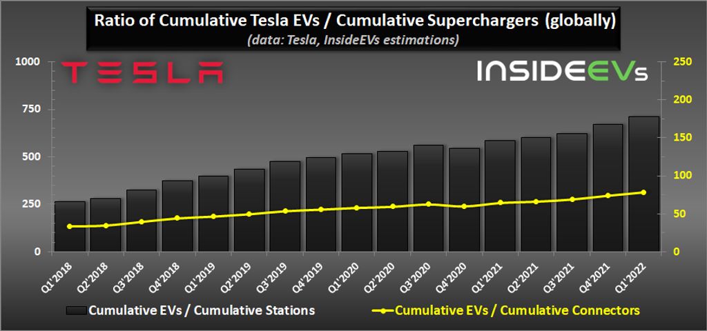 In Q1 2022, Tesla’s new sales divided by the number of new Superchargers, show 1,250 cars per station and 144 cars per stall.