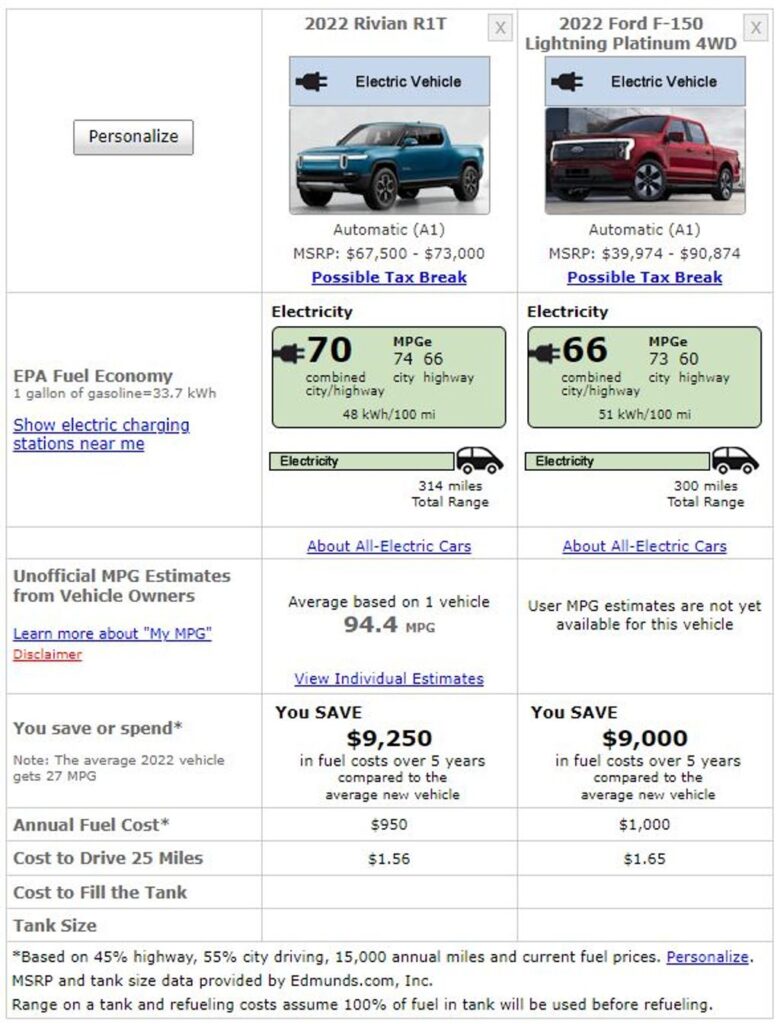 As you can see, the R1T, which is notably smaller than the Lightning, has an EPA-estimated range of 314 miles. According to the EPA’s site, the truck returns a combined 70 MPGe in a mix of city and highway driving. The EPA also specifies that it will use an average of 48 kWh to travel 100 miles.