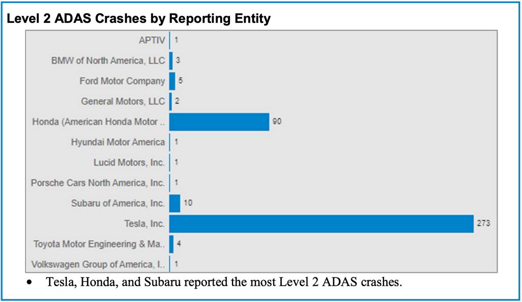 Now while that may sound pretty bad, it actually isn’t when you see the bigger picture. Data was provided to the NHTSA by 11 automakers, and in next place for number of Level 2 ADAS accidents is Honda with 90 crashes, followed by Subaru with 10 crashes.