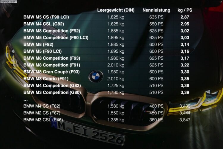 While you’d be tempted to think these changes would be enough to give the CSL the best power-to-weight ratio among all BMWs, that’s actually not the case. Our German colleagues at Bimmer Today crunched the numbers and concluded the flagship M4 with its power-to-weight ratio of 1 hp / 2,95 kg trails behind the M5 CS. As the table below shows, the now-defunct super sedan moves 2,87 kg with one horsepower.