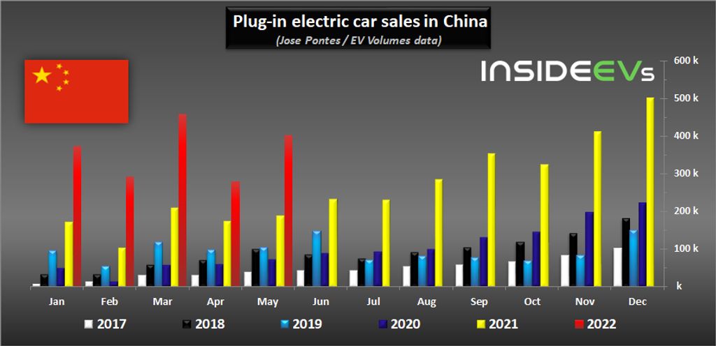 According to EV Volumes’ data, shared by Jose Pontes, some 403,029 new passenger plug-in electric cars were registered in China in May, which is 109% more than a year ago. The result represents also more than half of the global plug-in market.